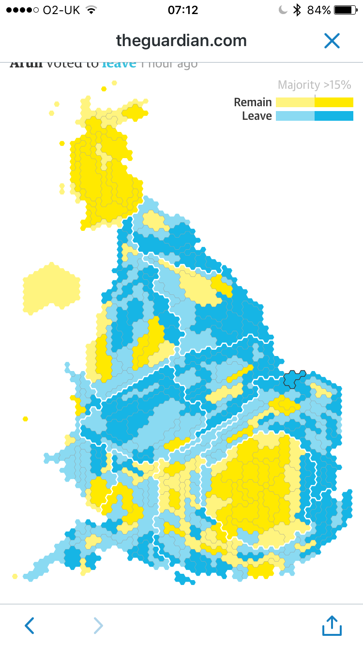 So during today I have been responding to calls and trying to keep up with the pace of change. I have to admit having seen the polling last night – and the surge in the £ allegedly off the back of some very expensive City exit polls – I assumed like most that this referendum had gone to the wire but would ultimately split 52/48 but in favour of Remain. I had said all the way through the campaign that this was enough for victory but the issue wouldn’t go away with that level of support. We would have to be revisiting the issue of our relationship with Europe on a regular basis. Even if we won the question had not been put to bed. However, I woke up to the shock news like I am sure millions of people have done today that we are to #leave.