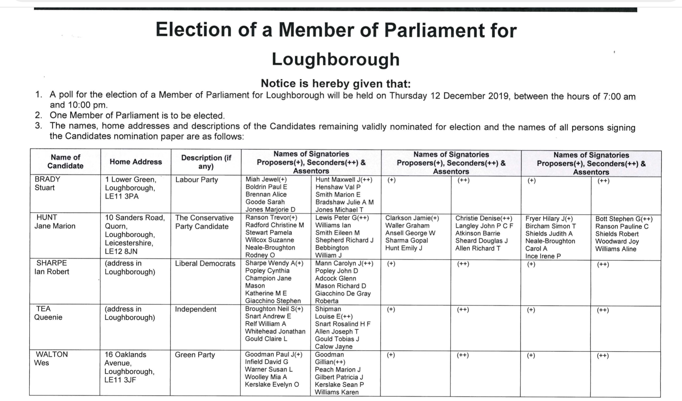 So we have fairly typical party list for Loughborough standing. It is strange not to see another right wing party like Brexit UKIP or BNP this time round. Their vote has never been enormous but they have generally been around trying to make noise!